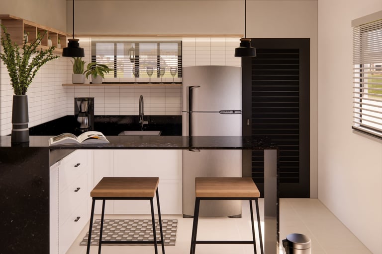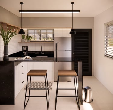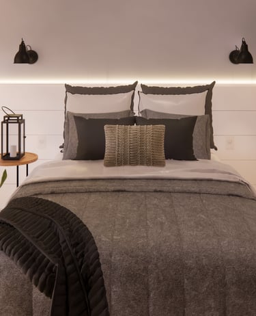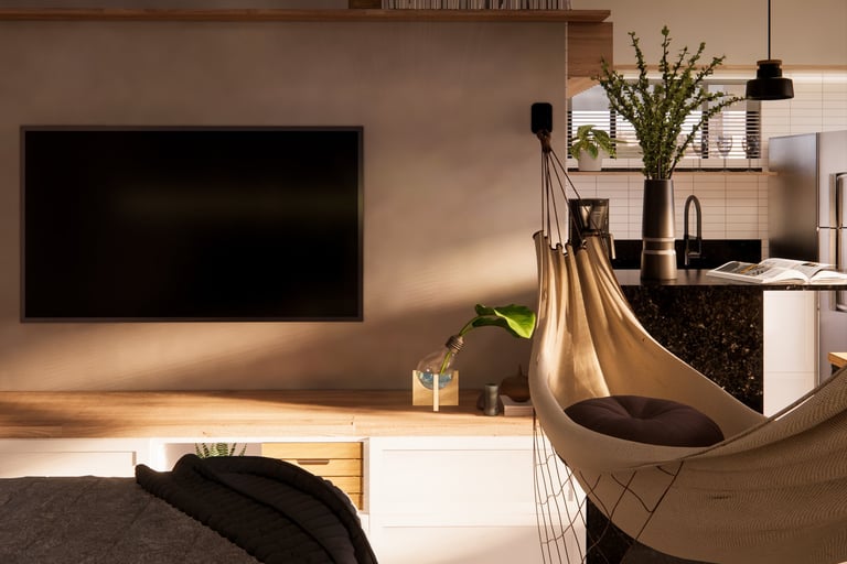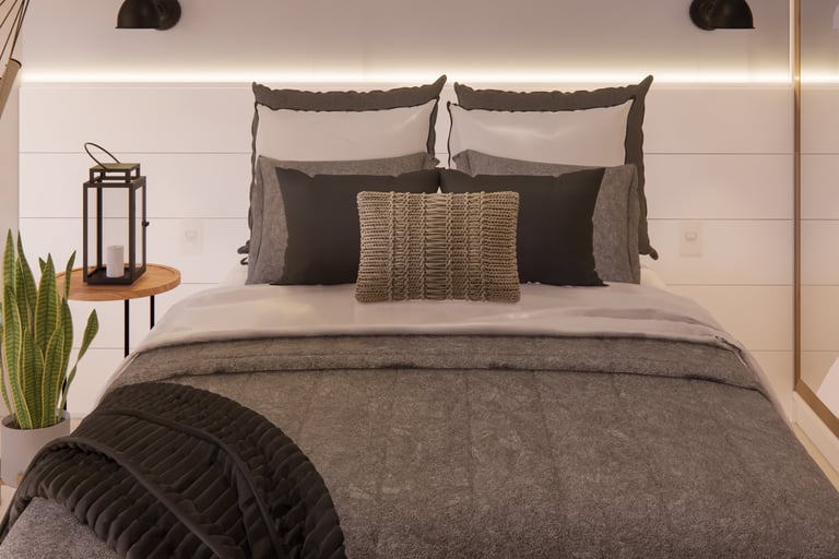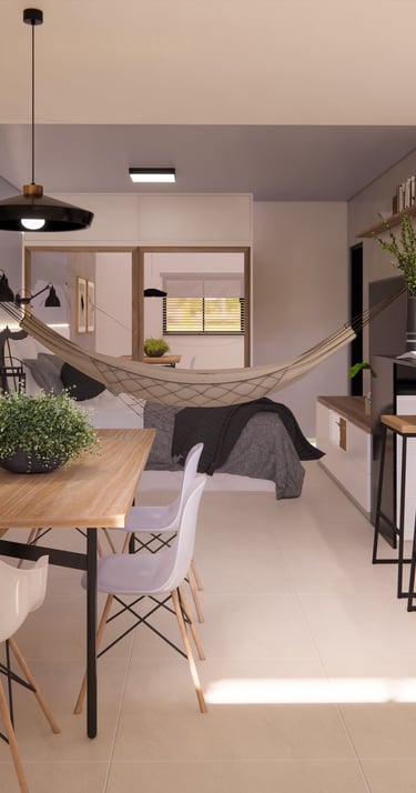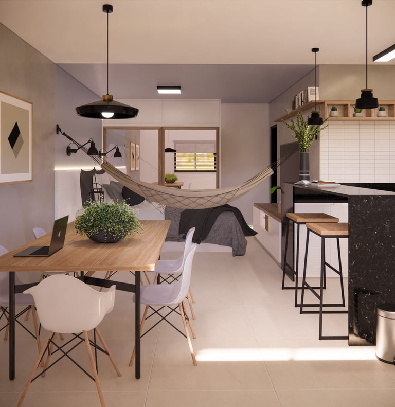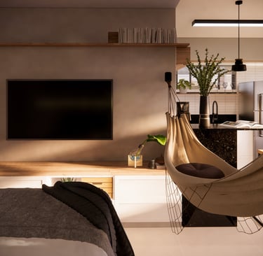 Chalé Integrado Projeto que valoriza a funcionalidade em espaços compactos, unindo quarto, estar, jantar e cozinha em perfeita harmonia. A paleta neutra com madeira traz aconchego, enquanto a iluminação estratégica reforça o clima acolhedor e moderno do chalé. O resultado é um espaço compacto, prático e elegante, perfeito para quem busca bem-estar e estilo em um só lugar.