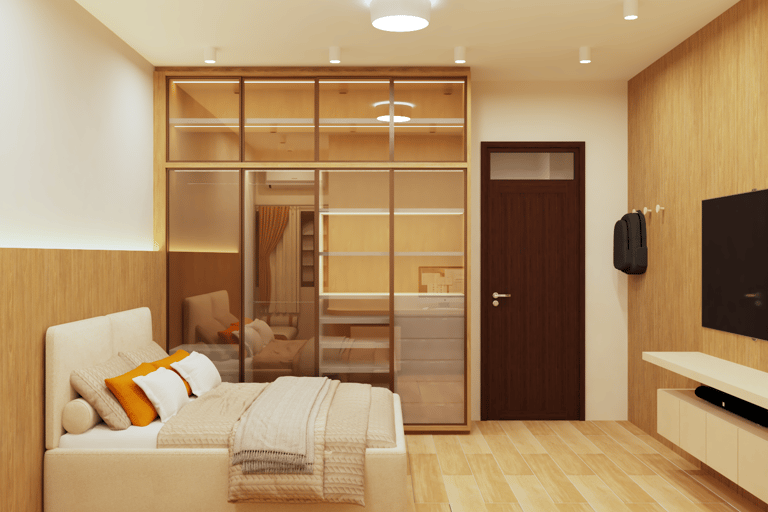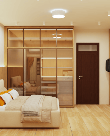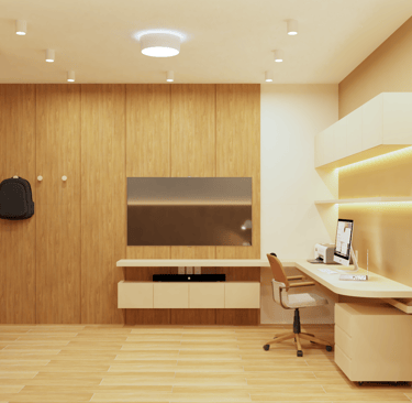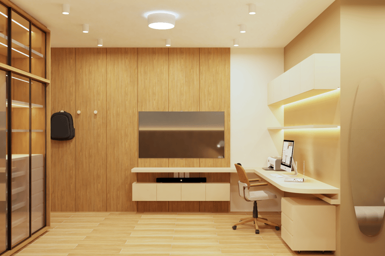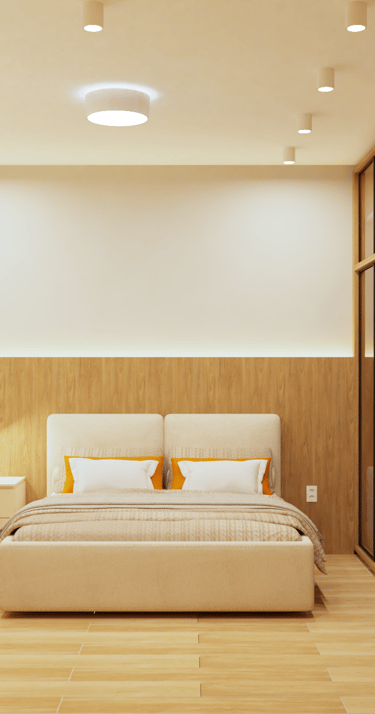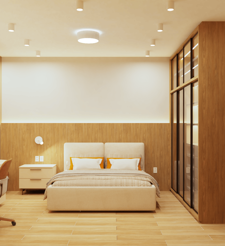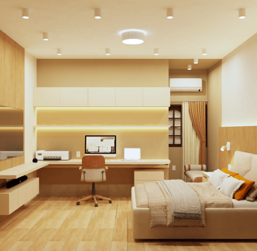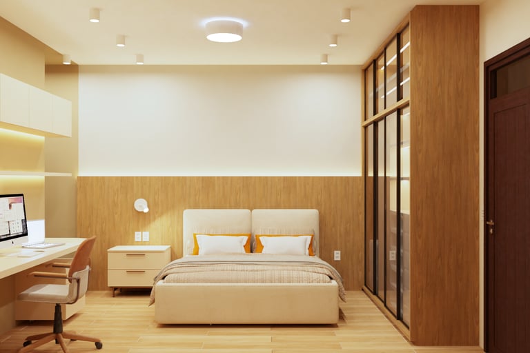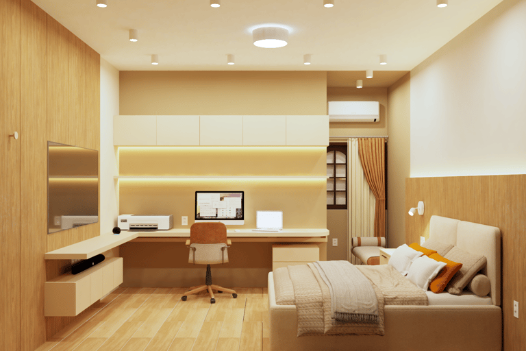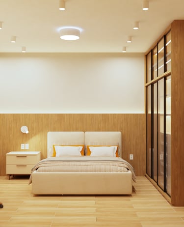 Esse quarto foi projetado em estilo moderno e aconchegante, com paleta em tons neutros e madeira clara. A iluminação indireta e os spots no teto criam um clima sofisticado. O espaço integra área de descanso e home office, com cama estofada centralizada, bancada ampla com armários e closet planejado com portas de vidro. O resultado é um ambiente funcional, elegante e acolhedor.